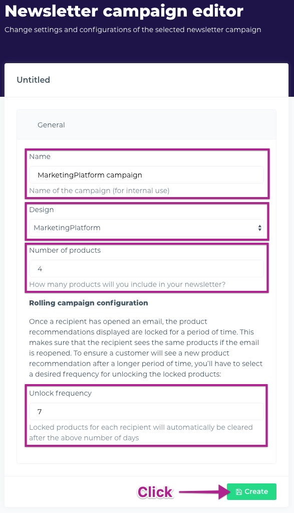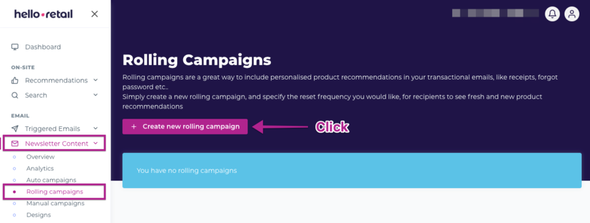After creating the design, you need to create a campaign - this will define the conditions for how Hello Retail automates the product recommendations. There are three campaign modes, and you can read more about them here. The solution best suited for MarketingPlatform is the Rolling campaign, where you only have to do the setup once, and everything will run automatically from there.