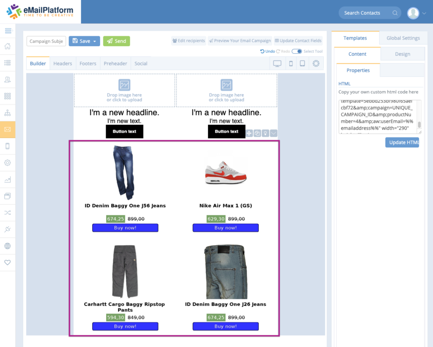 After clicking Update HTML, you'll see the newsletter update with your product recommendations, as shown below.
