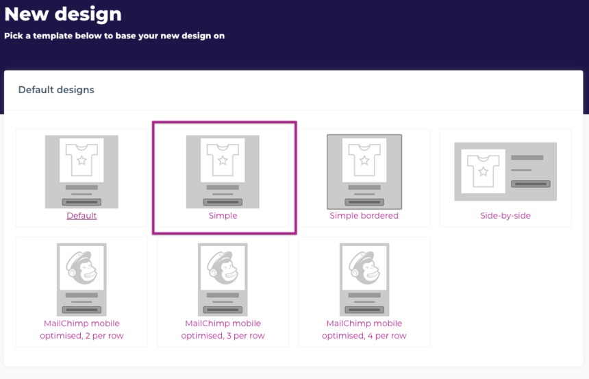 Then you'll see a list of designs from which to start. In this guide, we choose Simple, which is a picture over the title, previous price, and current price.