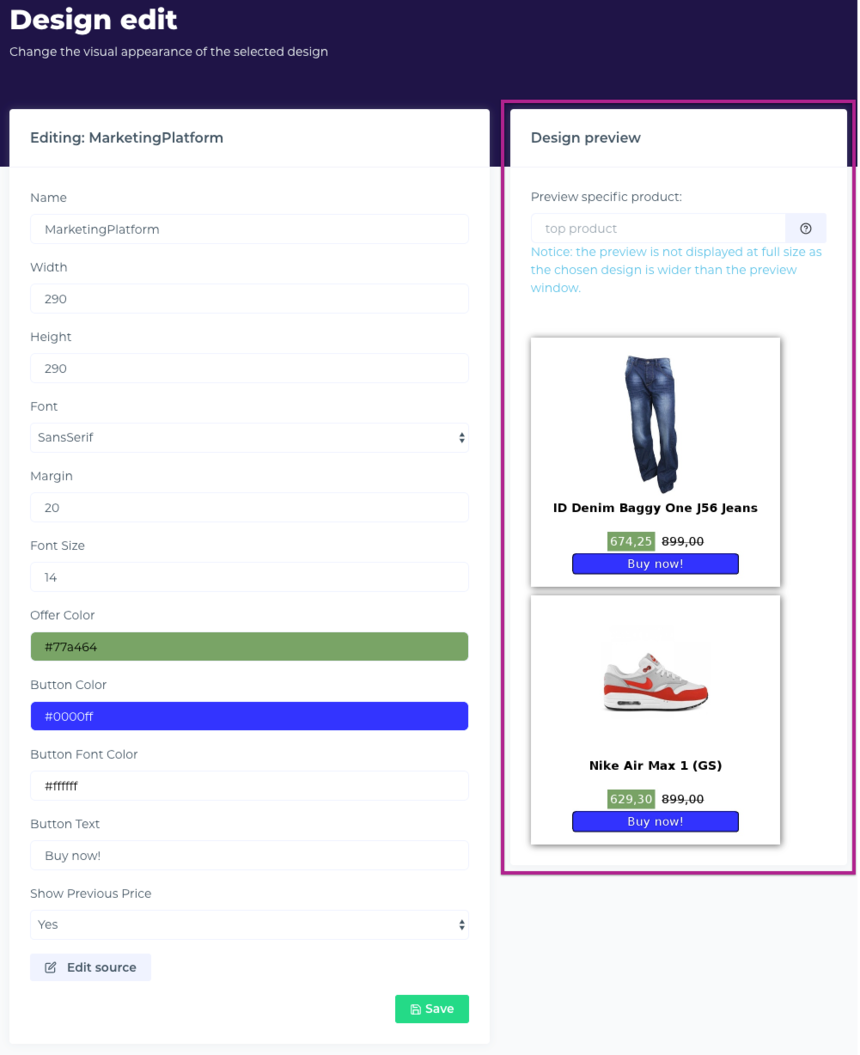 After clicking Create, you'll see an example of the design with your products, and you can fine-tune the design to make it perfect. Remember to click Save if you made changes you want to keep.