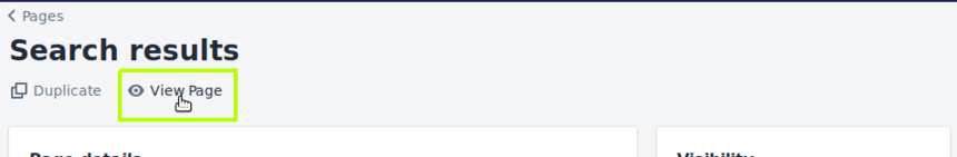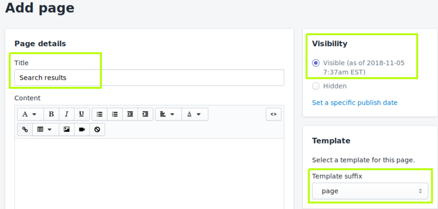 Step 4: In the page editor, please write a meaningful title, e.g., "Search results" in Title. Make sure the option "Visible" is chosen under Visibility. Choose "page" under Template.