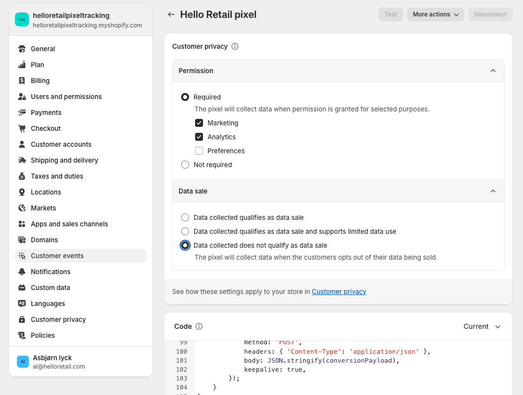 The variable hr_trackingIsAllowed is based on the combined return values of Shopify.customerPrivacy.analyticsProcessingAllowed() and Shopify.customerPrivacy.marketingAllowed(). Make sure to update this logic if the default case does not apply to your store. Other calls available from customerPrivacy: Shopify.customerPrivacy.marketingAllowed() and Shopify.customerPrivacy.saleOfDataAllowed().