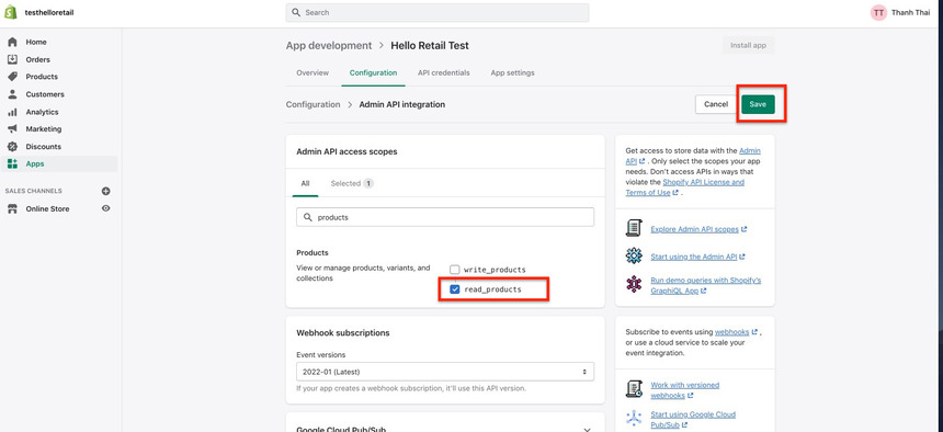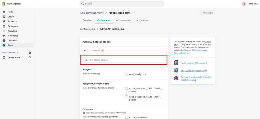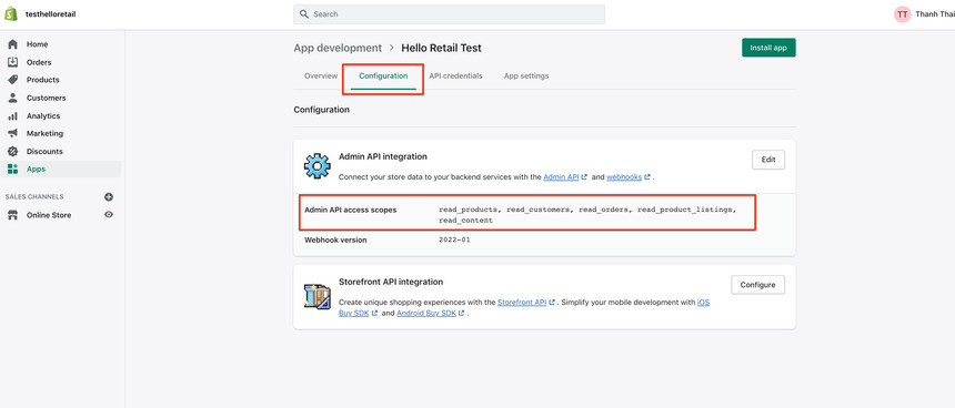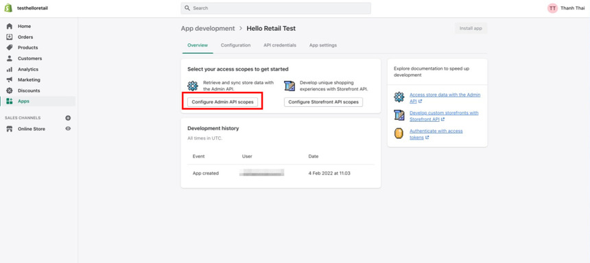 - Next, the overview of the created app will look like this. Click on the Configure Admin API scopes button.