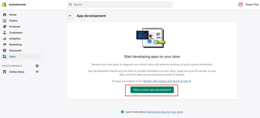 - Click on the Allow custom app development button.