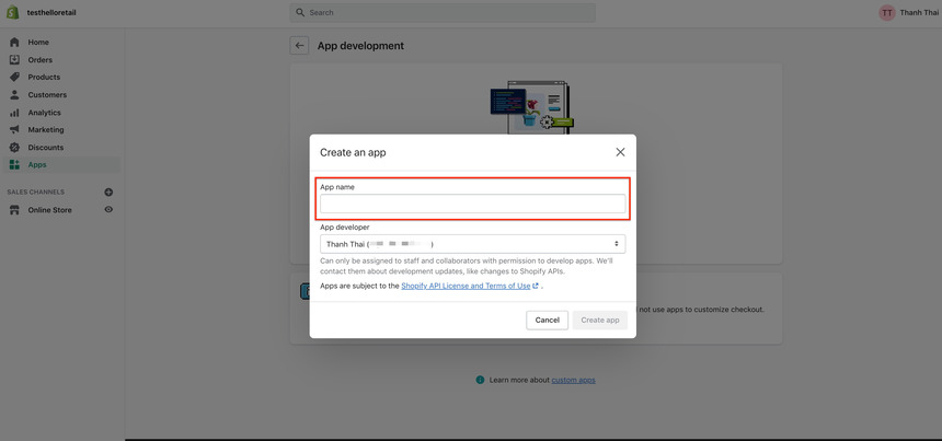 Inside the Create an app view, input an App name associated with Hello Retail. Then choose the App developer appropriate from your company.