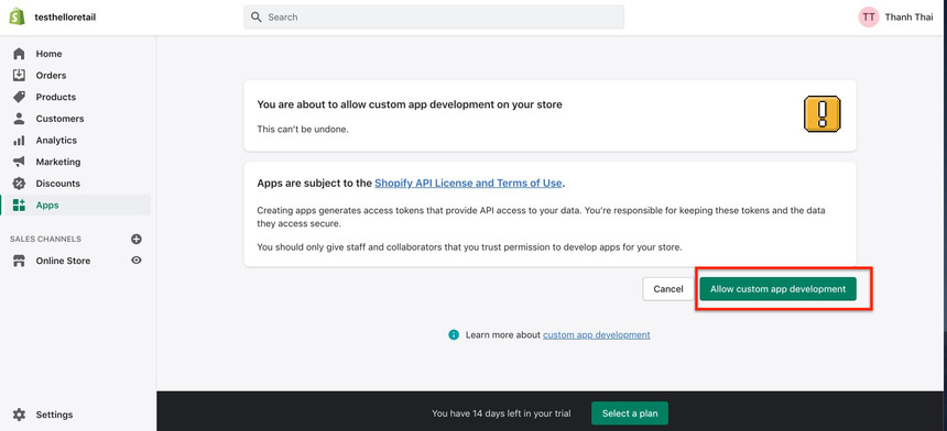 - Read and accept the warning by clicking on the Allow custom app development button.
