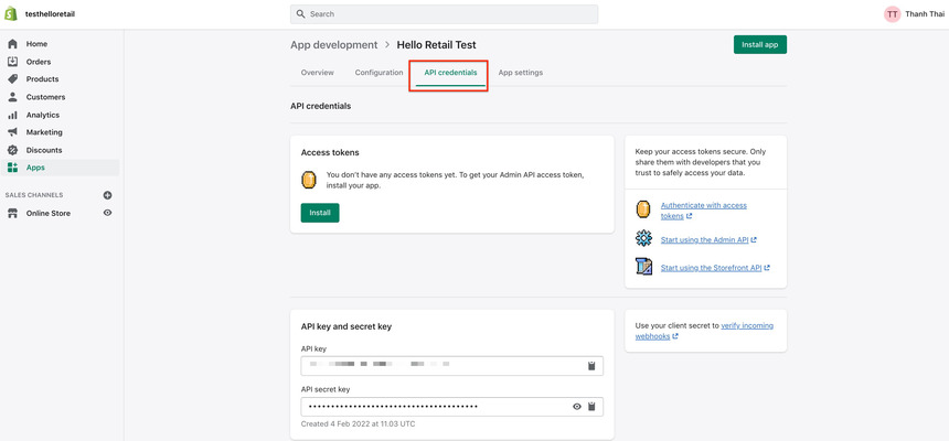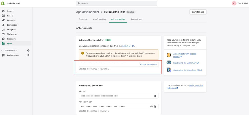 - After the completion, click on the green Install app button to prompt the Admin API access token. Copy this generated token.