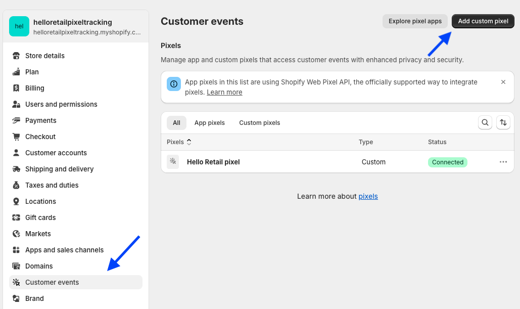 Click on the menu for Customer events and then on the button Add custom pixel in the top right corner.
