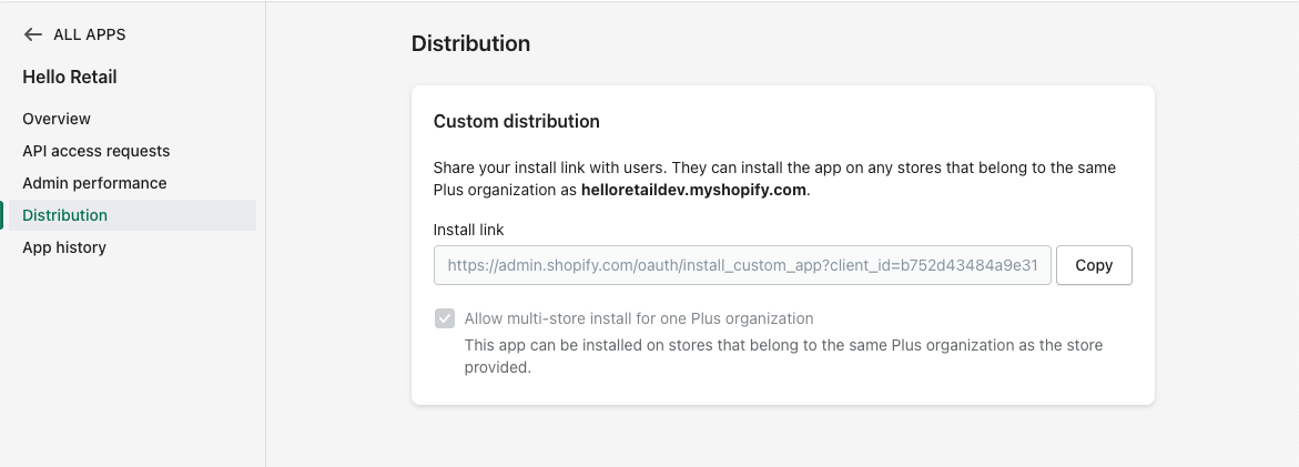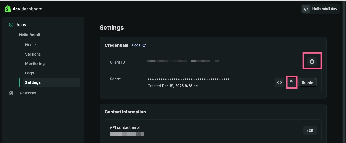 9. After that navigate to Settings, where you will find the Client ID and Secret, which you will need within Hello Retail to authenticate the app.