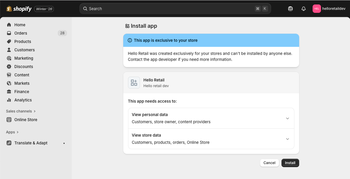 In this guide, you will set up Hello Retail with Shopify, including API credentials, tracking and conversion scripts, and a blank page for search.