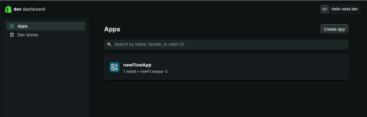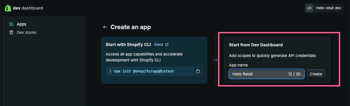 - Choose the option Start from Dev Dashboard and give your app a name .