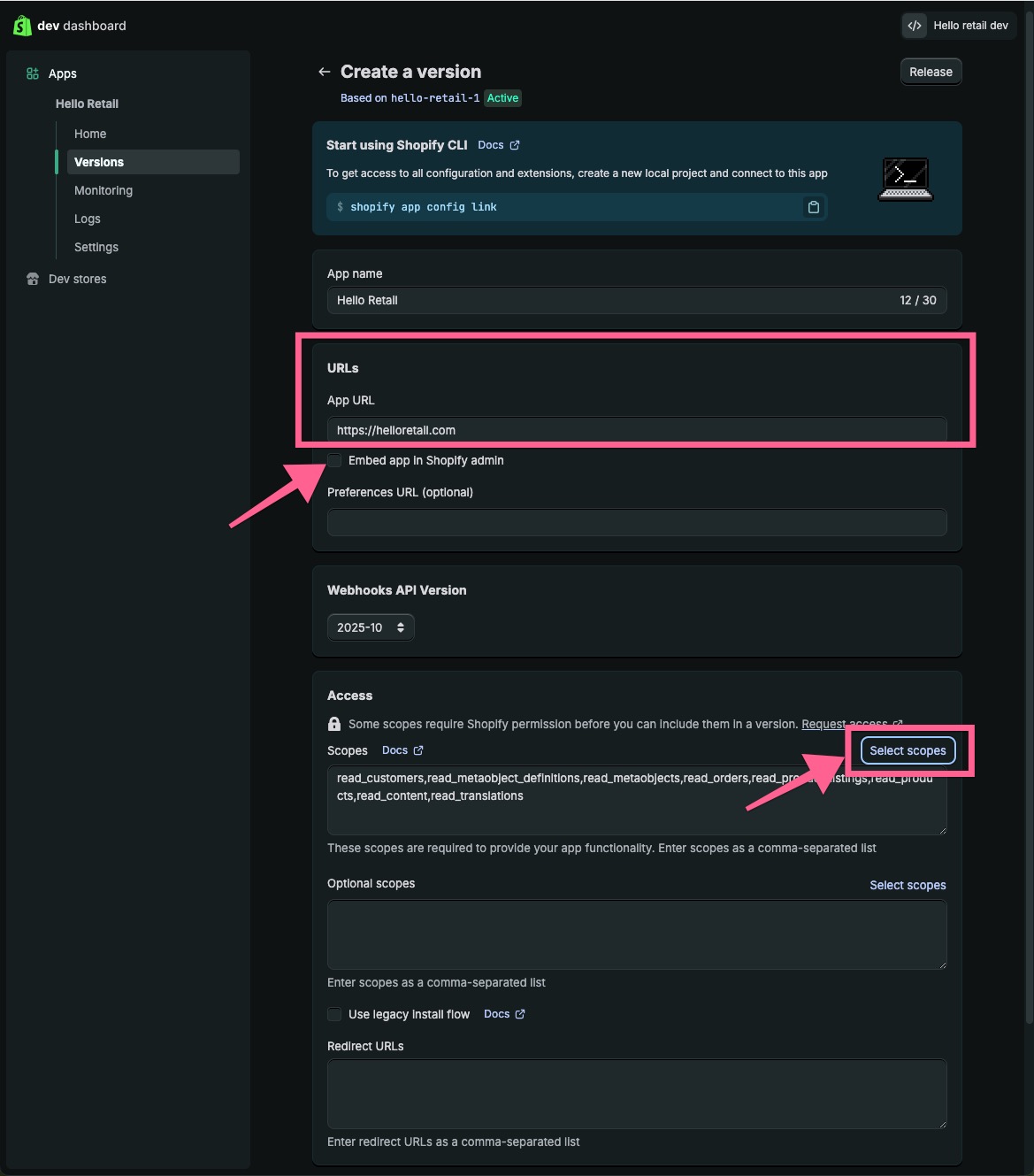 - In the following view add https://helloretall.com/ as an app URL, deselect Embed Shop in Shopify Admin and finally click on Select Scopes.