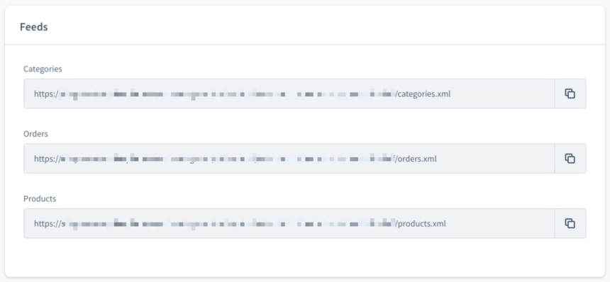 After the previous step has been saved, the page reloads, and you can now see the Orders and Products feed URLs.