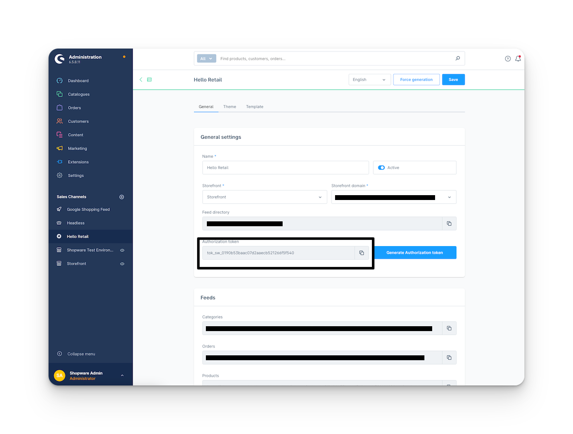 The token above is just an example. Be sure to use the actual token you can find in the Hello Retail Sales channel.