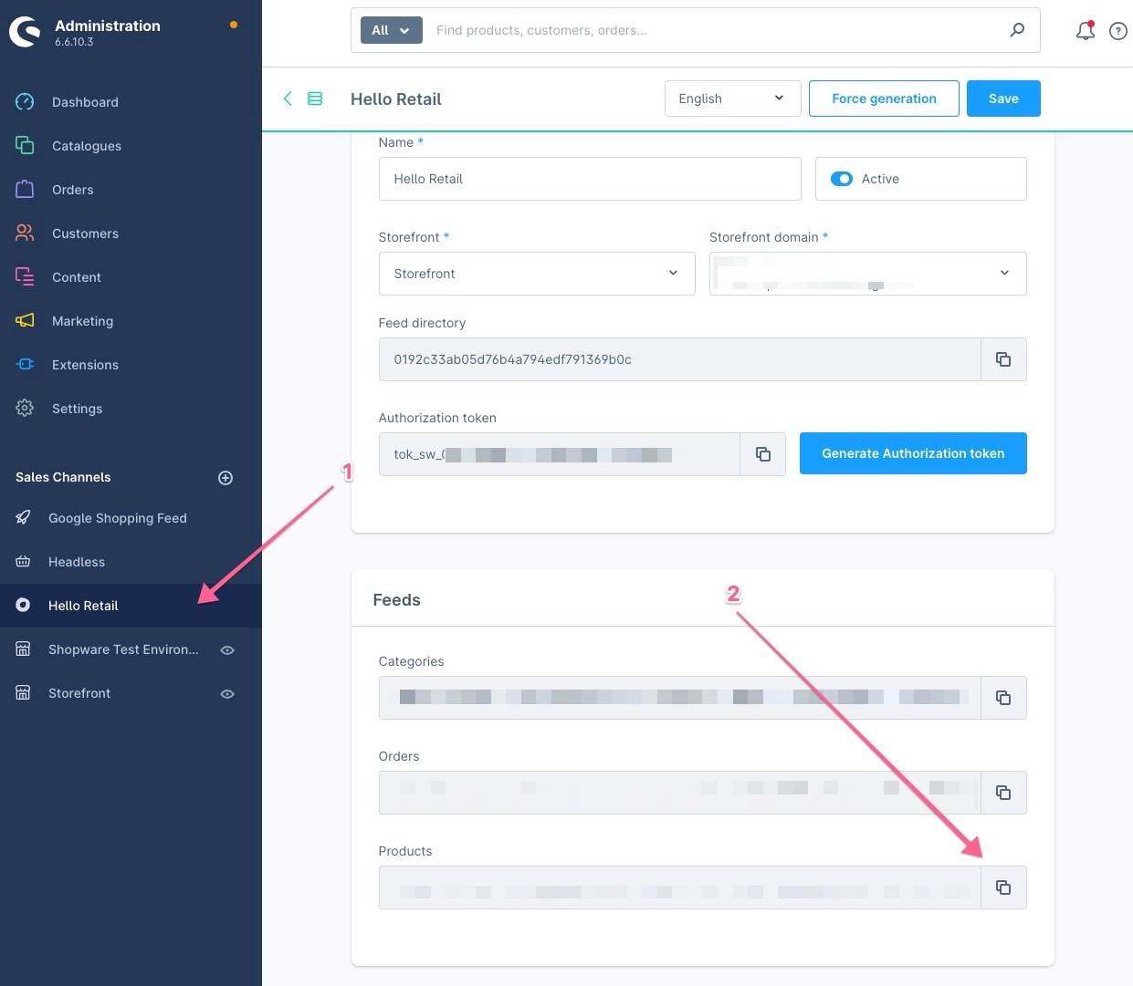 Copy and paste these 3 URLs, and the Authorization token and send them to support@helloretail.com along with the shop domain, and don't forget to save the Sales Channel.