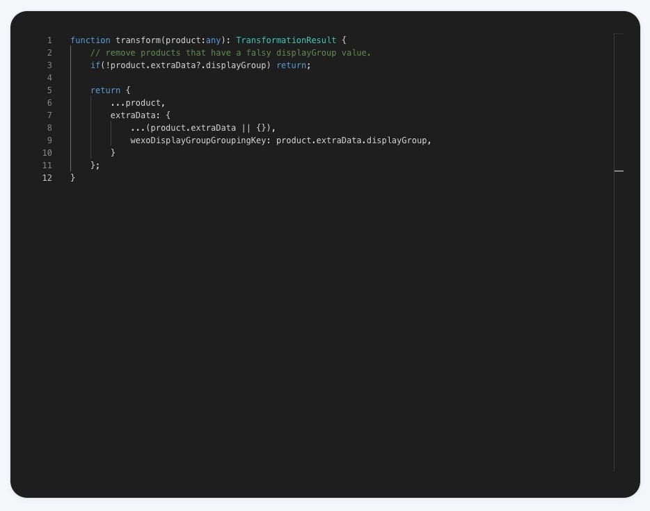 function transform(product:any): TransformationResult { // remove products that have a falsy displayGroup value. if(!product.extraData?.displayGroup) return; return { ...product, extraData: { ...(product.extraData || {}), wexoDisplayGroupGroupingKey: product.extraData.displayGroup } }; }Want to learn more about how transformations work? Check out the transformation guide.