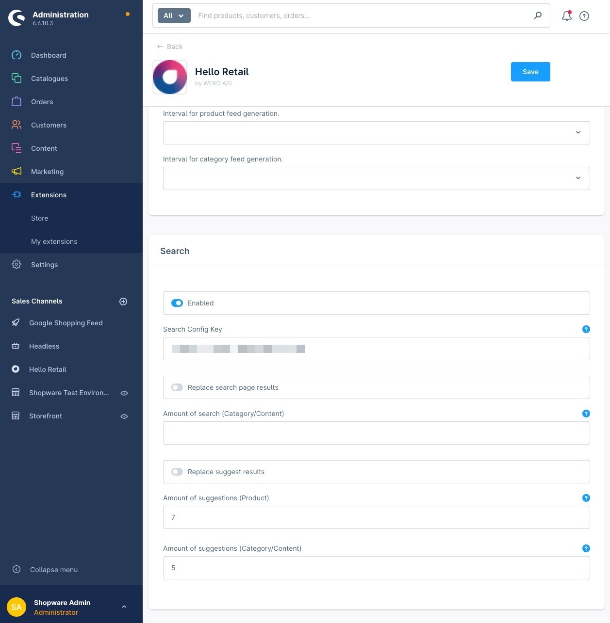 After updating the settings, you can test the connection between Hello Retail and Shopware: