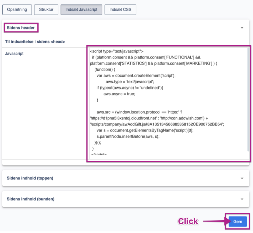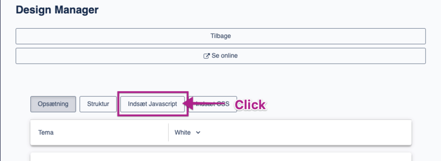 You have to insert the code in the header. You do that by navigating to Webshop -> Design and clicking Ret design on the listed active design.