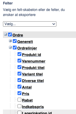 - Ordre - Ordrelinjer - Produkt id, Varenummer, Produkt titel, Variant titel, Diverse titel, Antal, Pris