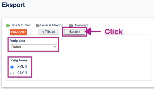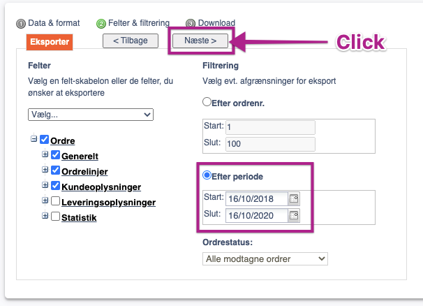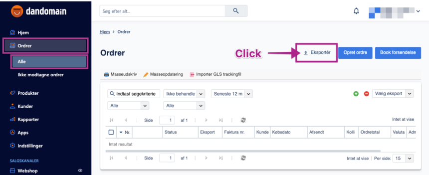 Navigate to Ordrer -> Alle ordrer and click Eksportér.