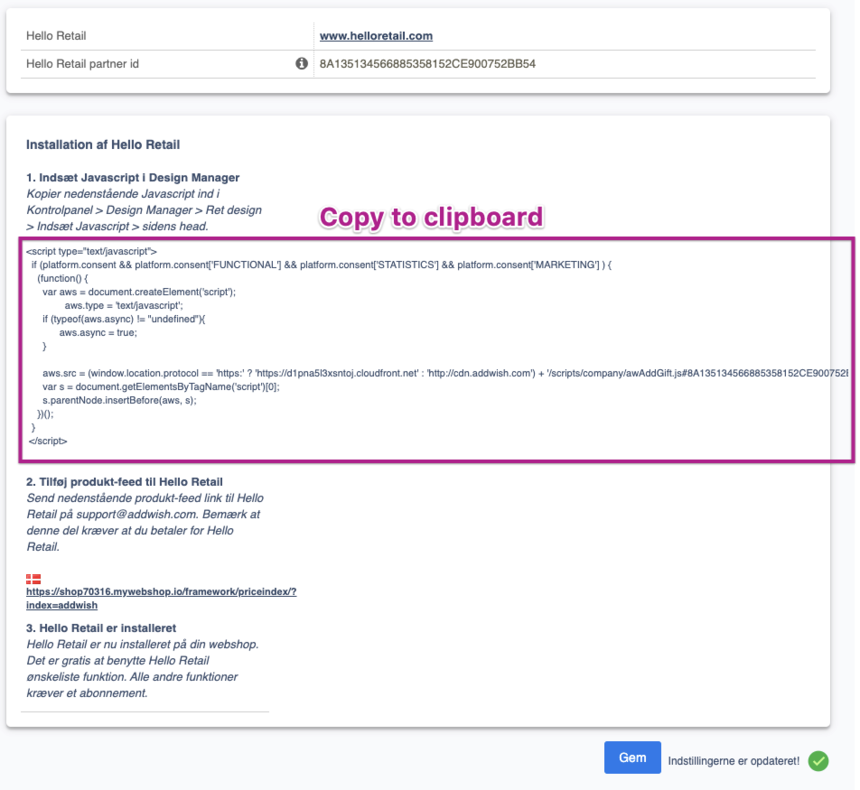 Copy the listed code snippet to your clipboard (ctrl+c on Windows / cmd+c on mac). Note that the Hello Retail partner id shown in the screenshot below is no longer needed: