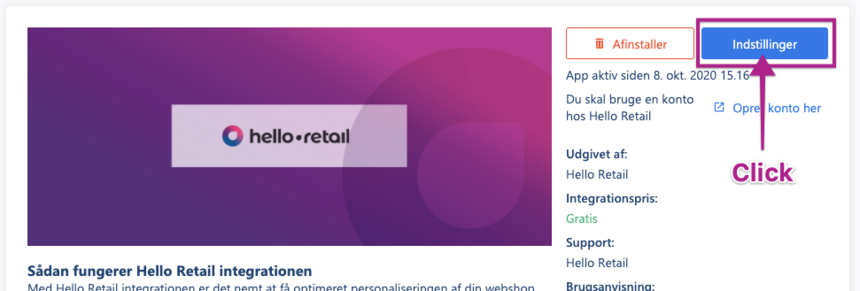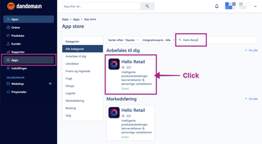 - In the left-hand side menu, navigate to Apps and search for Hello Retail. Click on the Hello Retail app.