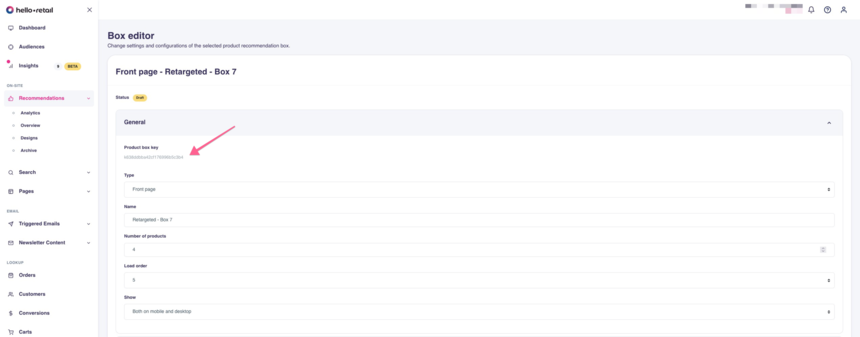 Product recommendations are created from the Product recommendations section of the Hello Retail dashboard. There you will see a list of current product recommendations and you will find a button to create a new one. When creating or editing a product recommendation box a range of options is available.