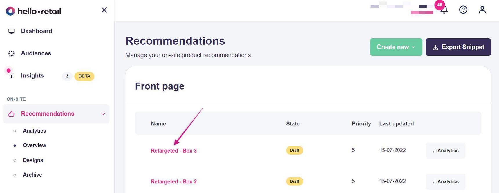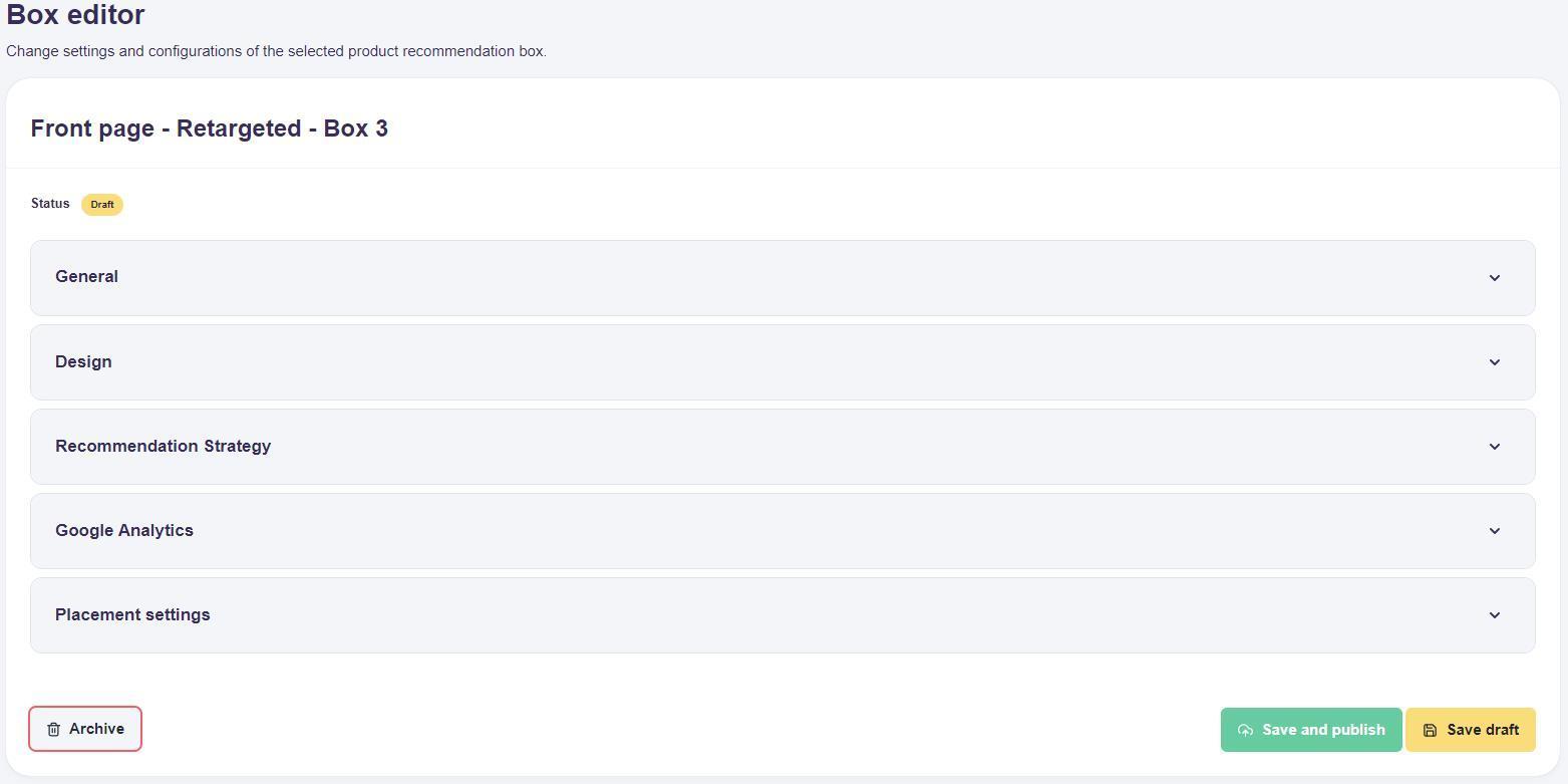Step 3: Here, you can edit the settings of the Product Recommendation box: