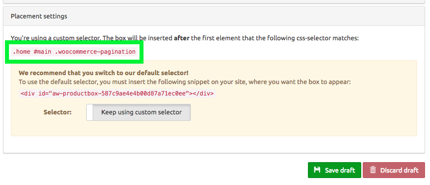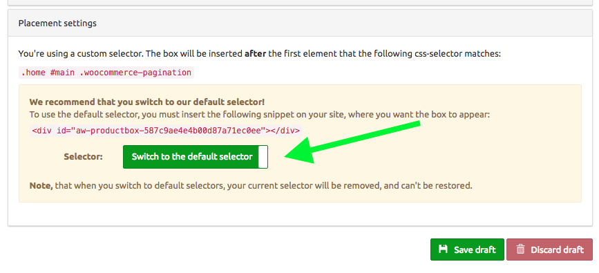 And if you wish to change this - you can choose to toggle the selector settings to "Switch to the default selector", then you will be able to use the default selector - by adding the code snippet representing the box to a page or template of your webshop: