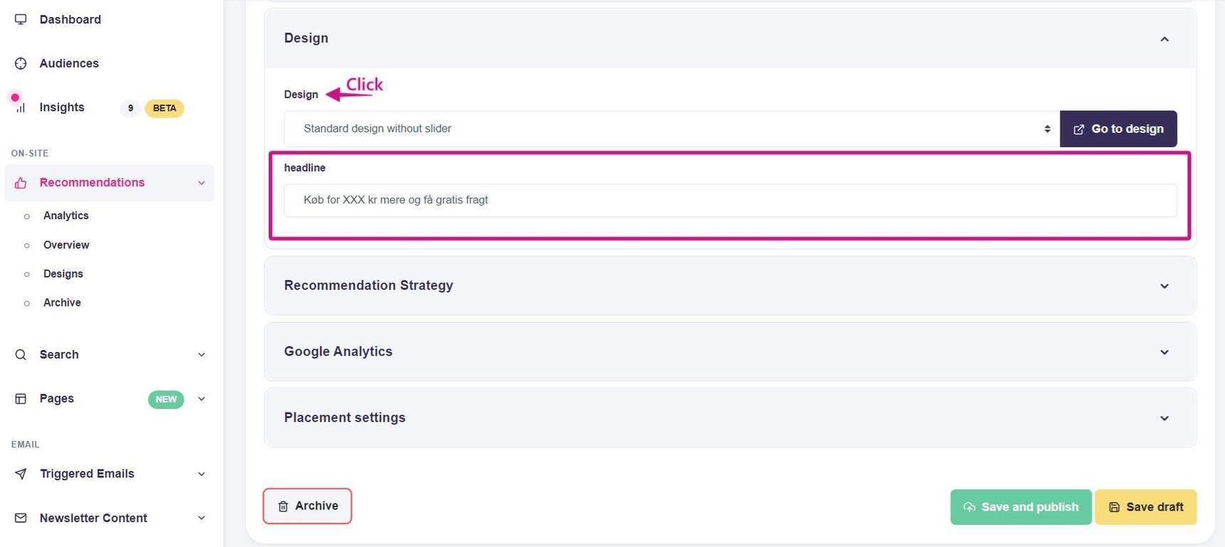 Step 3: Now you are on the edit page, for the specific Product Recommendation box. On this page click Design and here you can simply edit the headline.