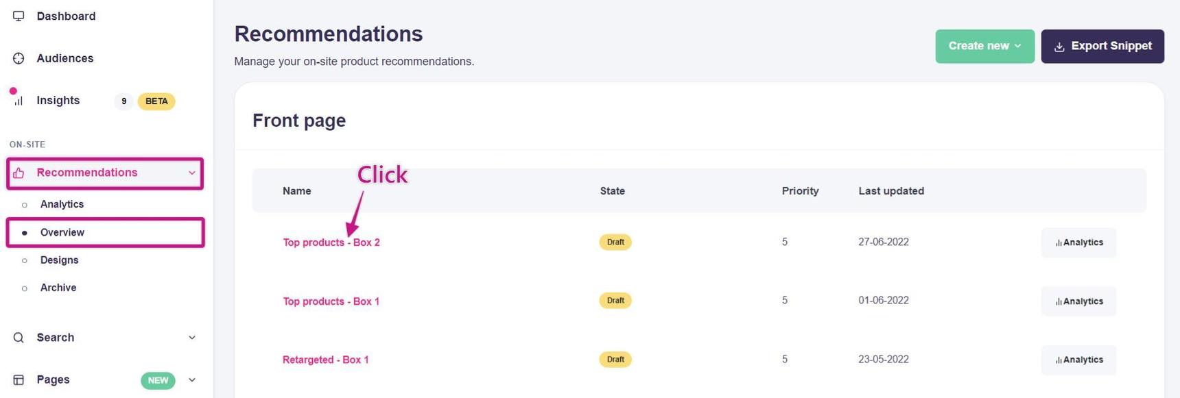 Step 2: Once you are logged in, navigate to Recommendations > Overview and click the Product Recommendation box you would like to edit: