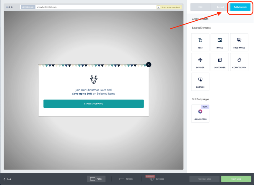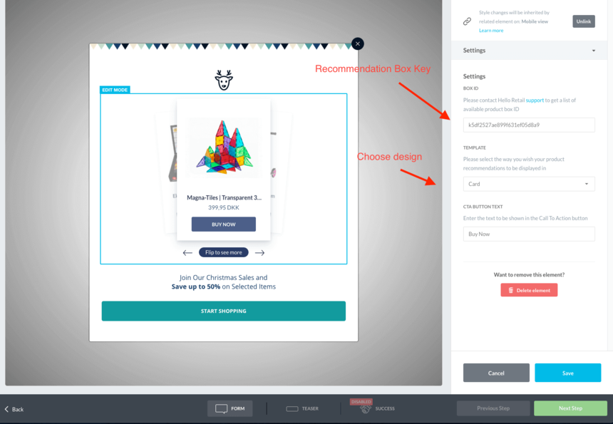 With the integration to our partner, Sleeknote, you can easily use Hello Retails personalization engine to promote your products in their popup boxes.