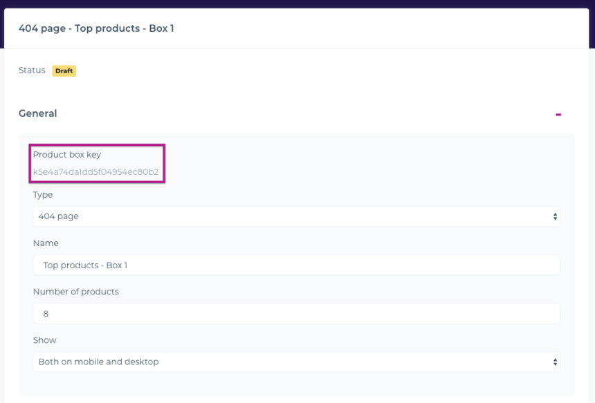 - Log into your dashboard and go to the recommendation box you want to use, and copy the Product box key.