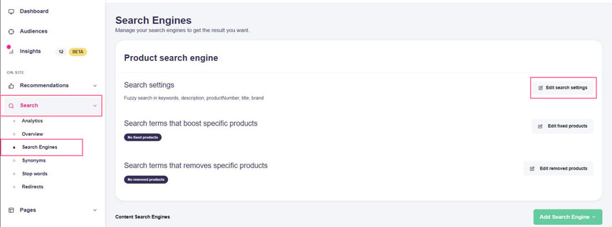 - Start by logging into your Hello Retail account. On the dashboard view, navigate to the left-hand side menu. Under the On-site section, click on Search to unfold the drop-down menu.