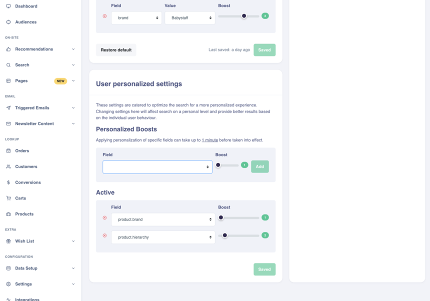 In the settings for User Personalized Settings, you will find Personalized Boosts. Through Personalized Boosts, you can change how Hello Retail will prioritize the parameters used for personalization—for example, brand, gender, color, category, or any other parameter available from your product data.
