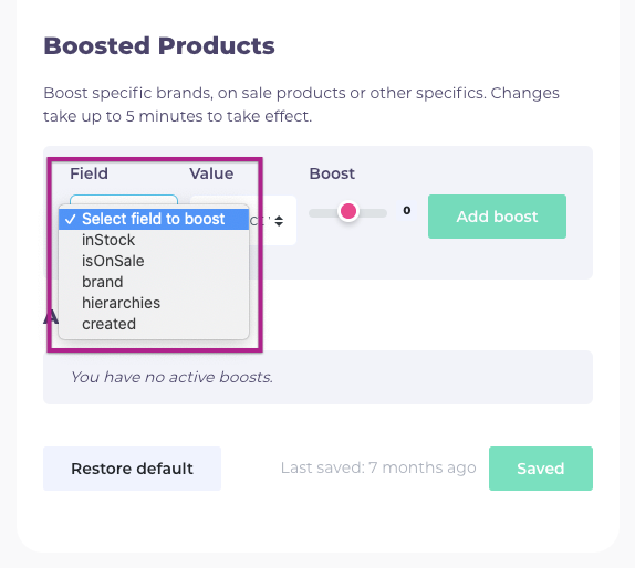 - Inside Boosted Products, it is possible to select a specific Field where you want to boost a particular group of products.