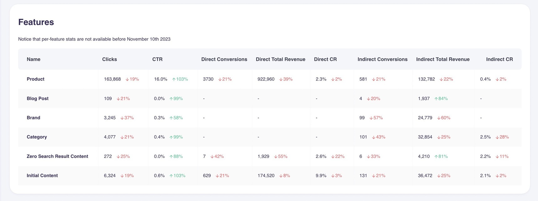 This menu lists a more detailed view of interactions with specific types of content besides the products on your webshop, as well as the sub-sections of the Search functionality like Initial Content. This should enable you to get a clearer picture of how the individual parts of the Search are being used.