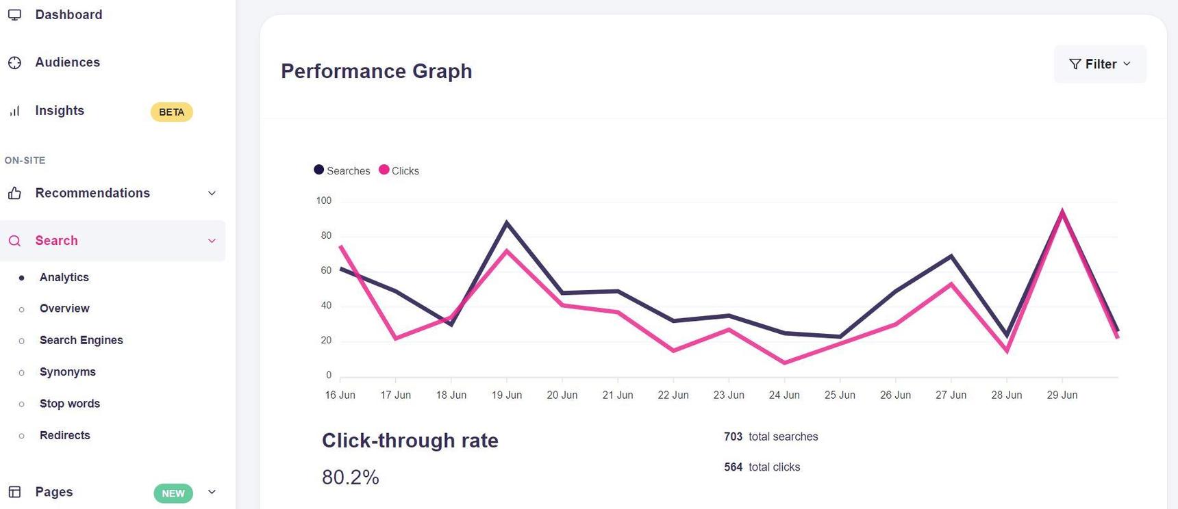 Here it is possible to filter the graph, in order to only see numbers for a specifically chosen search configuration. You can do that by clicking on the "Filter" button at the top-right of the Performance graph and select the configuration you are interested in. It is also possible to limit it to show a specific from- and to date.