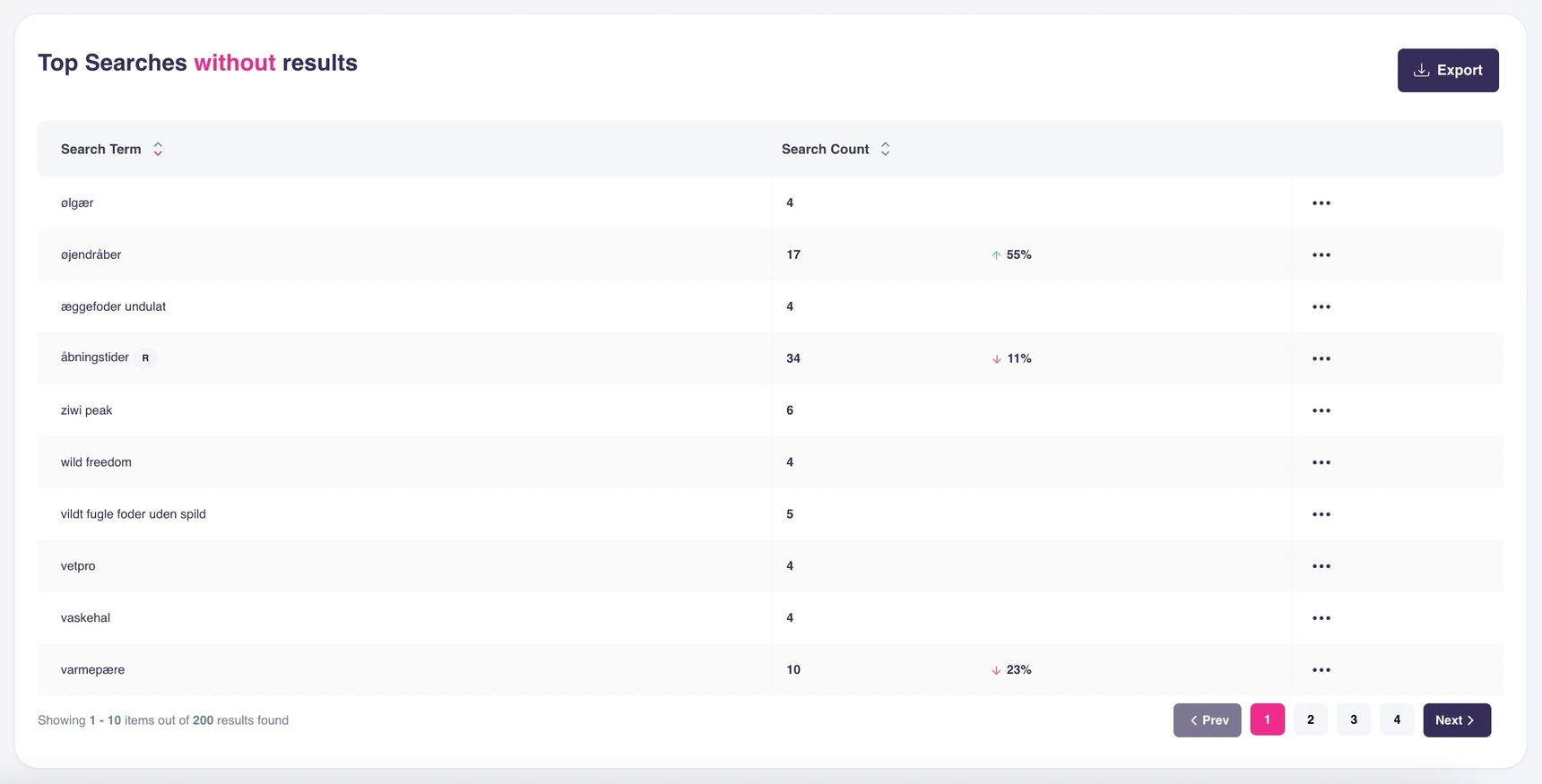Top searches without results will show you an analytics view of the search terms that did not result in products or content to show, as well as the terms respective search count. From here, it will also be possible to create a synonym or redirect for any of the terms present in the table.
