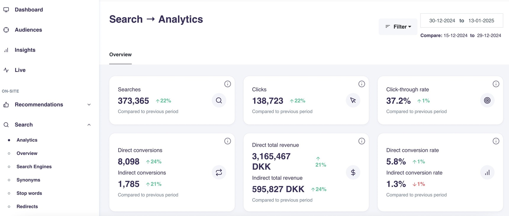 To benchmark the sales performance, Hello Retail tracks the average order size and conversion rate of visitors interacting with the search functionality and compares this with visitors who did not have any interactions with the feature. It also allows you to get a feel for how current trends among your visitors are moving, by allowing you to easily compare a current time period up against the same section in the past. The menu includes an overview of simple search usage, displaying the amount of average daily searches and clicks generated by your search setup, as well as more practical metrics about scenarios, where the search setup might not be helping with increasing the number of conversions or the order size.