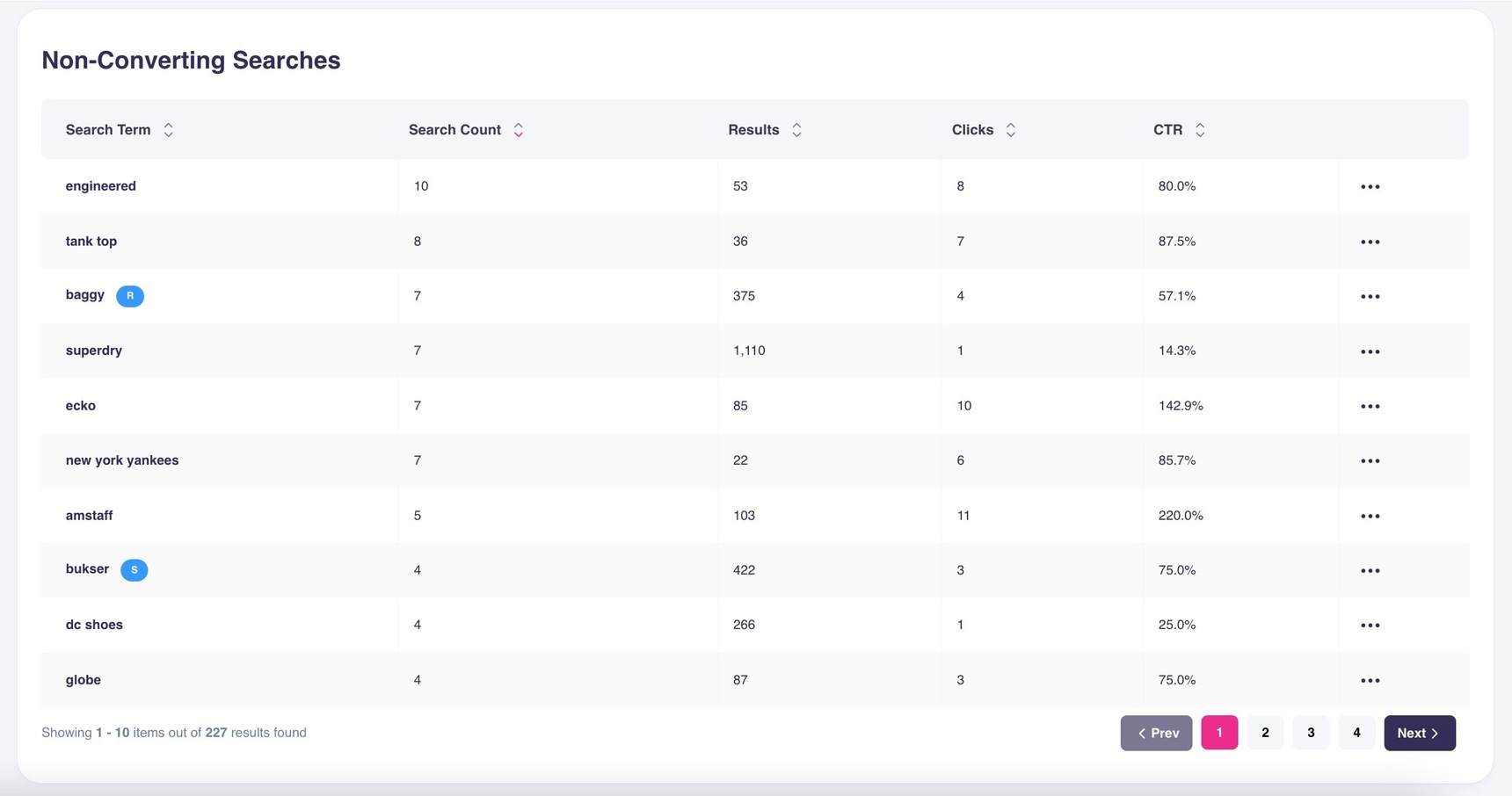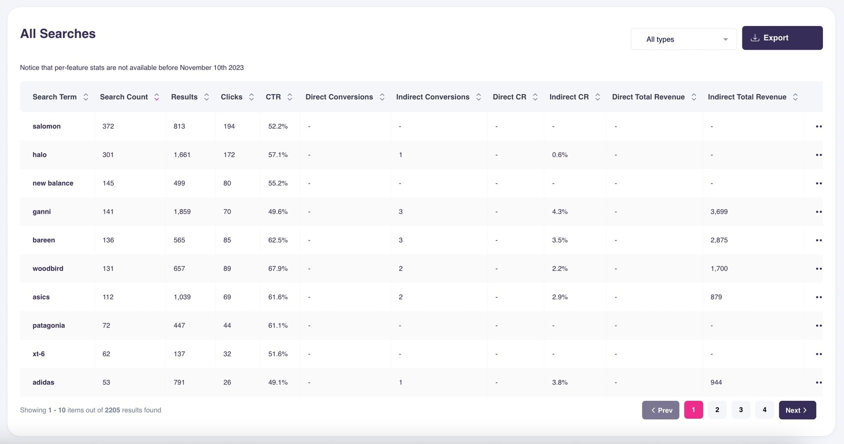 These analytics groups provide more detailed insights about the most popular searches. As seen below, these insights are then broken down into keywords, search count, conversions, conversion rate, and click-through rate for an easy overview of performance for each search term.