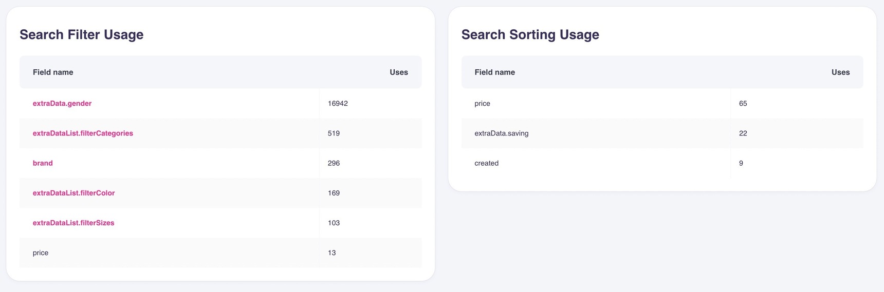 Finally, the menu contains a section that provides you with insights on how visitors are using the individual product Filters, as well as how many are using the option to Sort the search results after having been presented with a list of products, and in what order they prefer to have the products listed in.