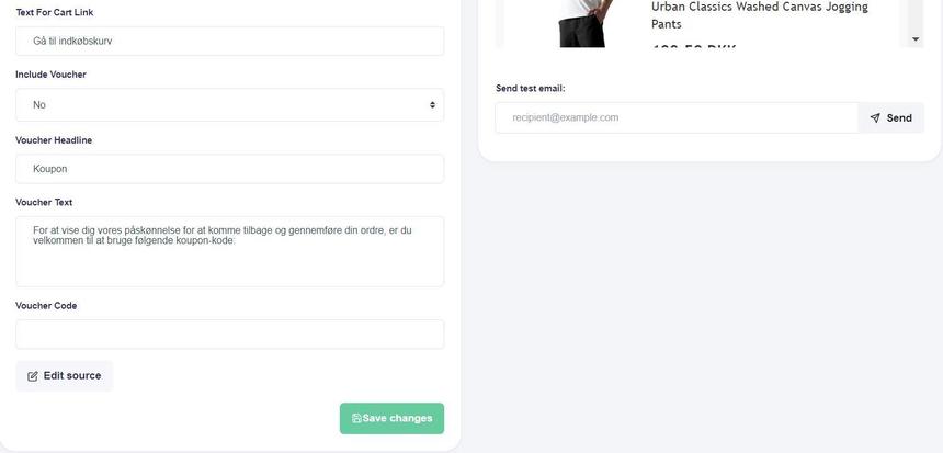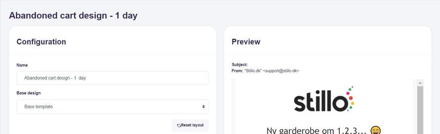 Save the changes, when you are happy with the abandoned cart content. You can also edit the code, if you wish to make more advanced customizations. You can always revert to the default if something goes wrong by pressing Reset layout at the top.