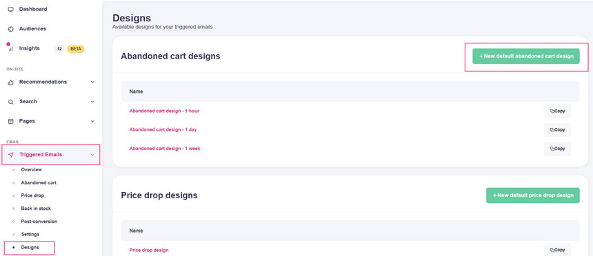 Navigate to Triggered Emails > Designs and press New default abandoned cart design.