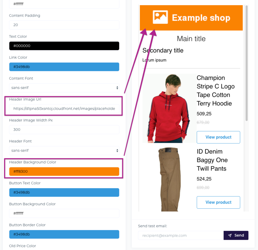 An important step is to add your company logo. You can either use a link to an external image or you can upload the image to assets and copy the name in the field "Header Image Url". Remember to change the Header Background Color to fit your design.