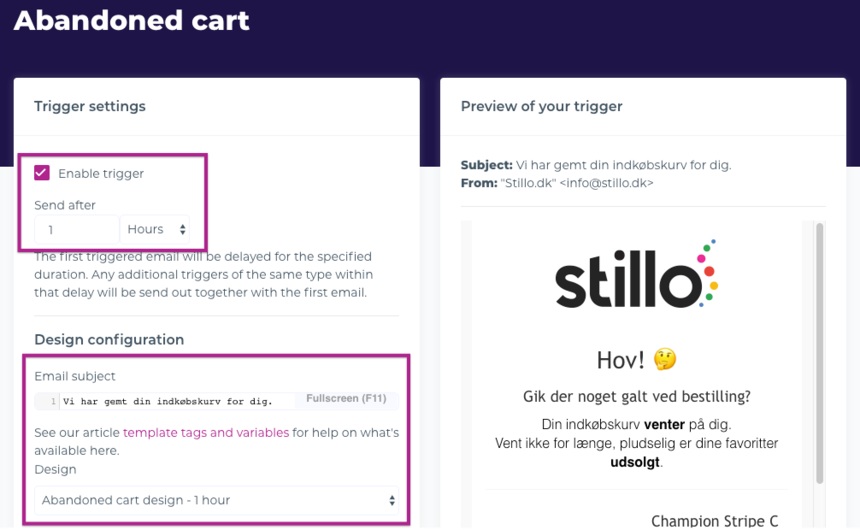Here you can choose to enabled up to three Abandoned cart triggers and set the time between each trigger (in case you want more than one).