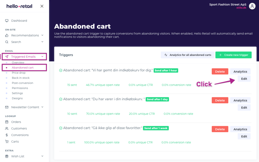 To enable the Abandoned cart trigger, navigate to Triggered Emails > Abandoned cart.